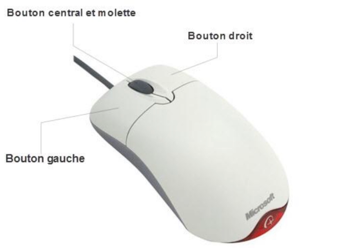 La souris traduit les mouvements de ta main en déplacement du curseur à l'écran. Elle comporte au minimum :