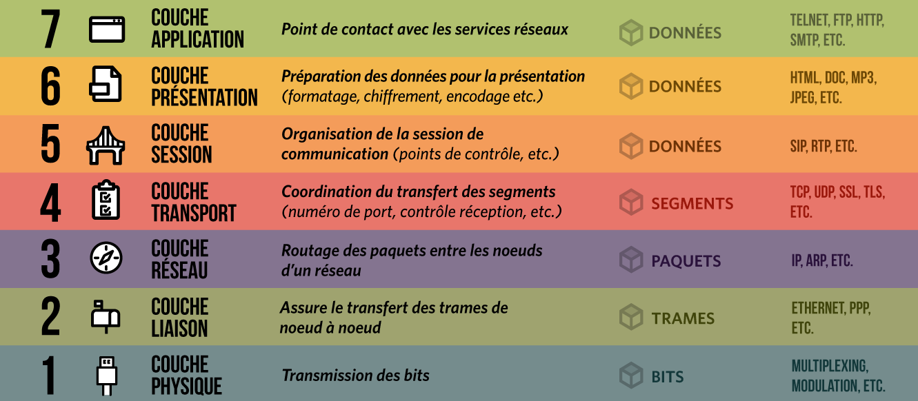 - Couche 5, 6 et 7 : Couche supérieures (couches session, présentation et application)