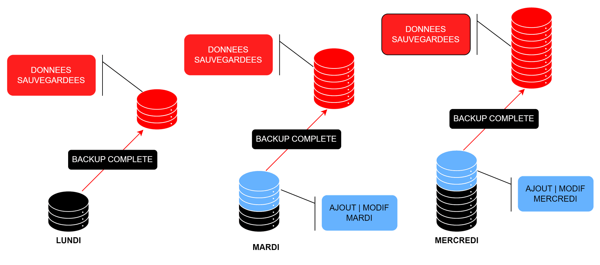 Contrairement à la sauvegarde incrémentielle, la sauvegarde différentielle sauvegarde toutes les données modifiées depuis la dernière sauvegarde complète, à chaque nouvelle exécution.